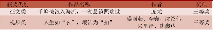 学院作品《人生如“衣”,廉洁为“扣”》、《千峰破浪入海流,一湖悬镜照瑞世》获评省廉洁教育优秀作品三等奖。