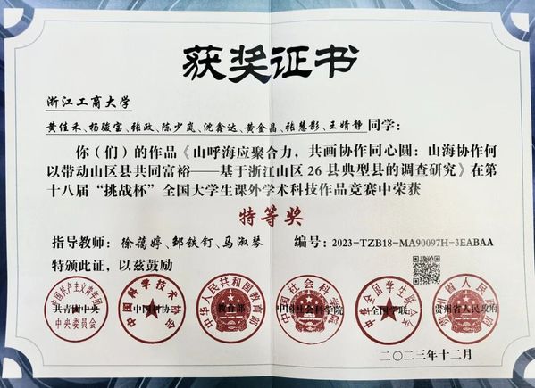 第十八届“挑战杯”全国大学生课外学术科技作品竞赛国家级特等奖