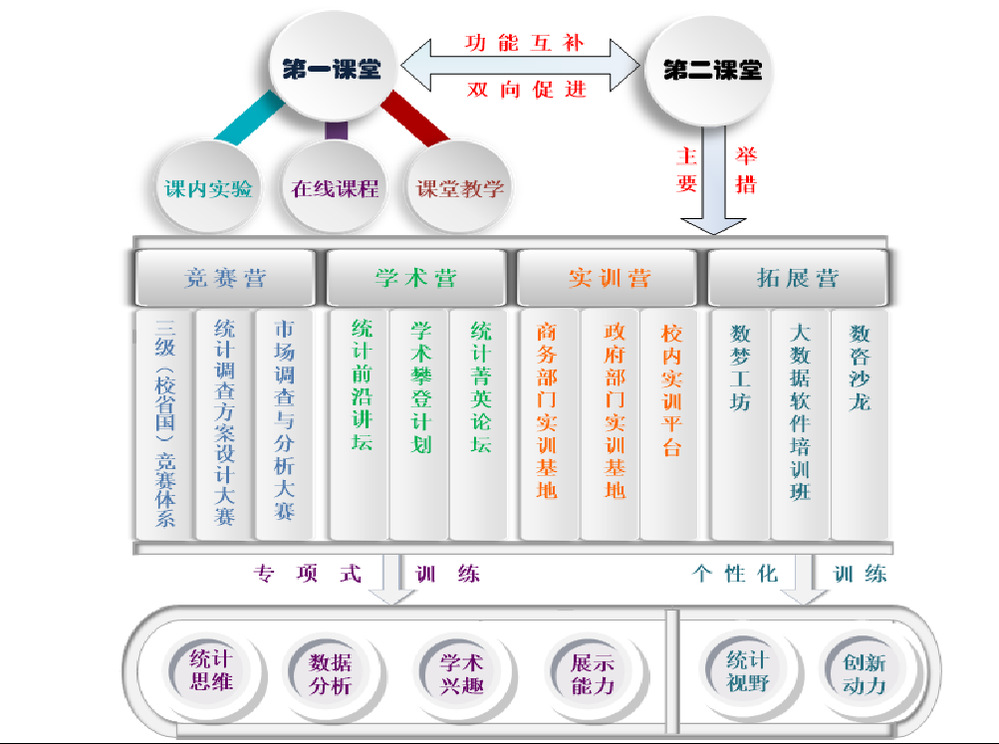 本科生培养以提升本科生统计应用能力为目标,构筑立体多元“1+4”CAMP能力培养模式,促使学生创新能力、专业素养持续提升。成果获浙江省教学成果特等奖(2022)。